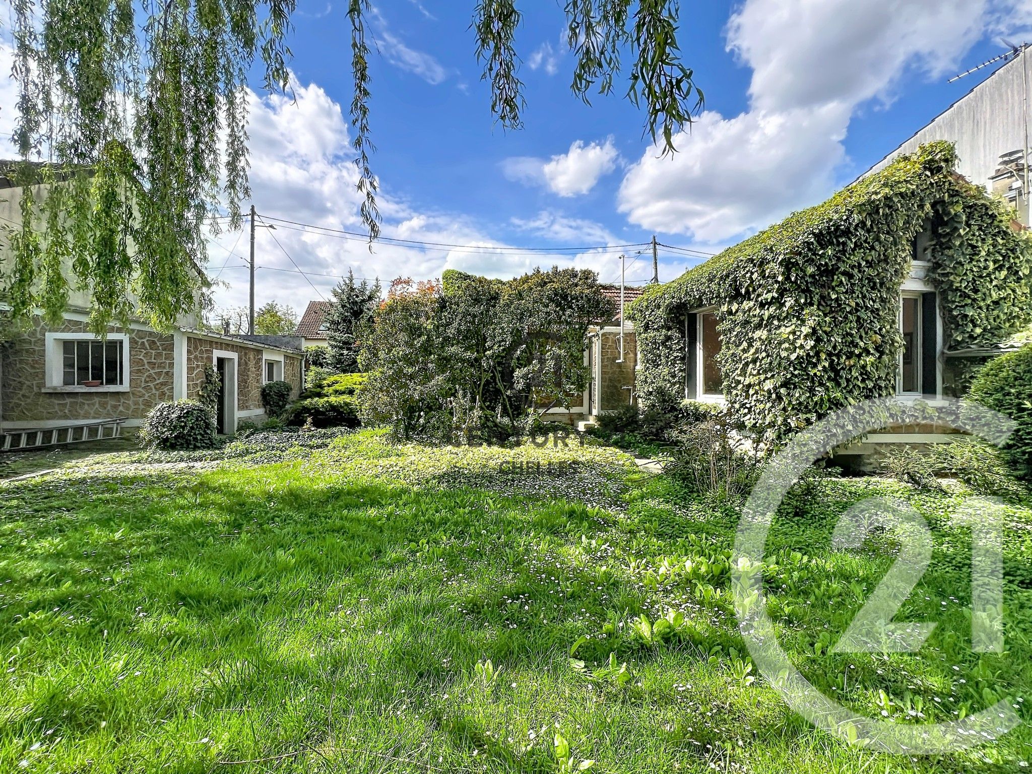 Dès l'arrivée, le charme opère avec une façade du terrain d'environ 20 mètres et le jardin est un véritable poumon vert ou trône un magnifique saule pleureur qui apporte une atmosphère paisible, tandis que la façade de la maison recouverte de lierre renforce encore le caractère et l'authenticité des lieux.